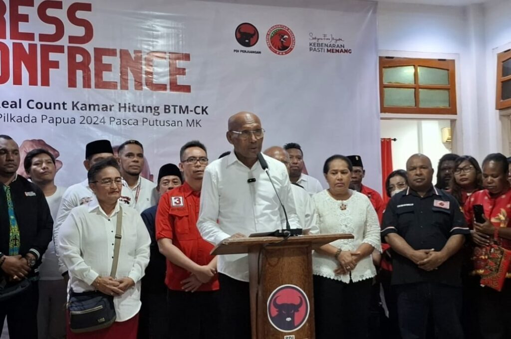 Jayapura-Papuarayanews.com Usai merampungkan hasil tabulasi internal, Pasangan calon nomor urut 1 BTM-CK menggelar deklarasi kemenangan pada Jumat malam (8/8). Didampingi pasangannya, Drh Constant Karma, Benhur Tomi mano melakukan pidato politik dihadapan para pendukungnya yang memenuhi pelataran kantor DPD PDIP. Dalam pidato politik BTM menyoroti dinamika PSU yang menurutnya penuh tantangan termasuk berbagai upaya sistematis menggagalkan […]